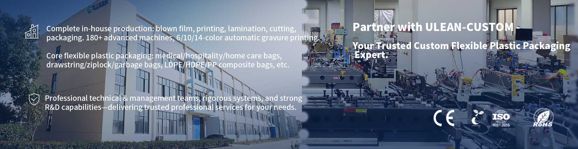 Fundada en 2004, ULEAN-CUSTOM es un especialista confiable en embalajes de plástico con sede en Tongcheng, Anhui, "Base de embalajes blandos de China central", con cómodo acceso a autopistas, ferrocarriles, aeropuertos y puertos para logística global.