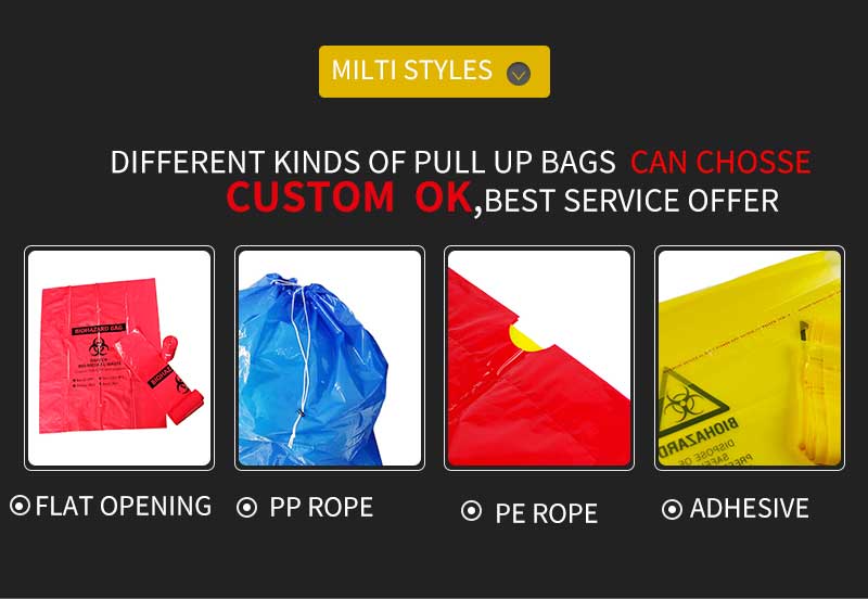 Nuestras bolsas desechables para residuos biológicos peligrosos están fabricadas principalmente con material PE, que es seguro, inodoro y a prueba de fugas.
